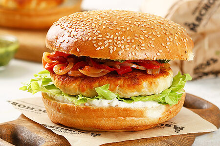 На воздушной белой булочке с кунжутом и чиа собрали неклассическое сочетание яркого и хрустящего с нежным и сливочным! Поджаренная котлета из индейки и два соуса — ароматный Песто и Ранч на соевом молоке с травами — дополнены свежим болгарским перчиком, кольцами сладкого красного лука и листьями салата Айсберг.