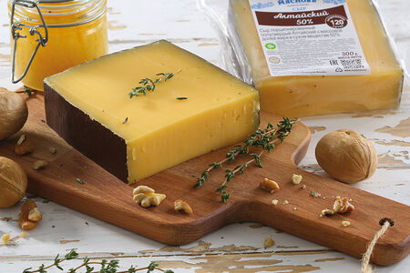 Сыр «Алтайский» любят за насыщенный терпкий вкус и глубокий янтарный цвет. Такое гармоничное сочетание получается в процессе созревания, которое длится не менее 120 суток. Алтайский сыр плотный с твердой структурой и рисунком в виде редких круглых и овальных глазков. Этот сорт сыра универсальный: подойдет и в качестве самостоятельной закуски, и в дополнение к вину или фруктам. Его также используют в составе десертов.