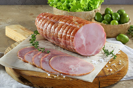 Сочный, нежный, аппетитный копчено-вареный деликатес с красивым рисунком на срезе.