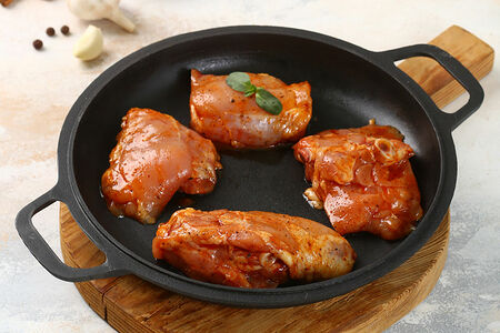 Аппетитные куриные бёдрышки на косточке в авторском маринаде из паприки, корицы, мускатного орешка и смеси перцев. Идеальный вариант для приготовления как на гриле, так и на сковороде: мясо получается нежным и сочным, с ароматом копчения и необычными мускатно-мятными нотками.