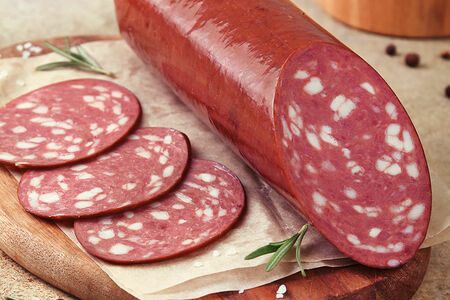Ароматная, плотная колбаса с упругой консистенцией, вкраплениями нежного шпика, ярким мясным вкусом с ноткой мускатного ореха.