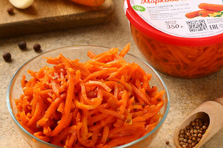 Морковь по-корейски – всесезонный салат. Летом – это полноценный гарнир к мясу, приготовленному на углях, и начинка для закусок в пите и лаваше, а зимой и осенью пряная морковка становится незаменимым ингредиентом витаминных салатов. Морковь по-корейски МясновЪ БУФЕТ готовится по проверенному домашнему рецепту только из натуральных продуктов – свежей моркови, пряностей, подсолнечного рафинированного масла, сахара и уксуса. В этом овощном салате сохраняются полезные свойства свежей моркови, а благодаря присутствию в составе пряностей и чеснока, морковь по-корейски улучшает аппетит, обладает согревающими и противовирусными свойствами.