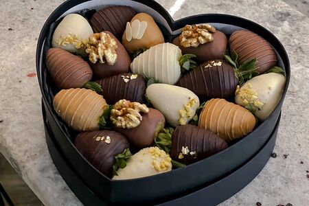 Клубника в шоколаде, бокс сердце черное S, пакет Labberry (21х23х21 см)
