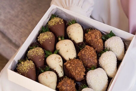 Клубника (16 шт.), покрытая белым и молочным шоколадом Callebaut, украшена вафельной и фисташковой крошкой, кокосовой стружкой и золотистыми брызгами. Подарочная упаковка: лента, фирменный пакет, открытка с инструкцией о хранении и теплыми словами