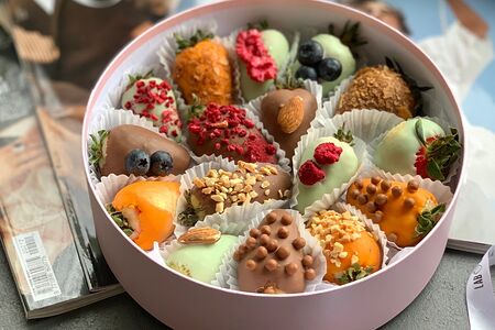 Сочная клубника в бельгийском шоколаде в круглом боксе с прозрачной крышкой. Для самых нежных поздравлений