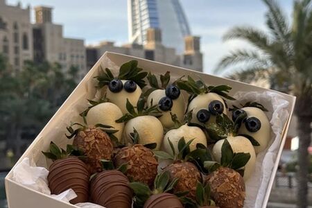 Клубника (16 шт.), покрытая белым и молочным шоколадом Callebaut, украшена полосками из шоколада, голубикой и вафельной крошкой. Подарочная упаковка: лента, фирменный пакет, открытка с инструкцией о хранении и теплыми словами