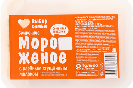 Мороженое ВЫБОР СЕМЬИ Сливочное ванильное с вареным сгущенным молоком 8%, без змж, контейнер, 800г доставка