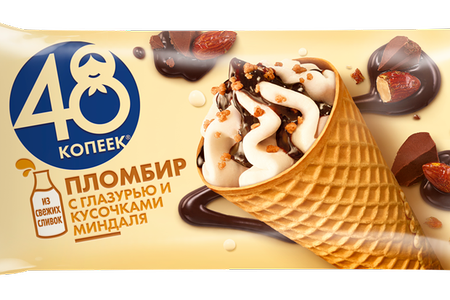 Мороженое пломбир 48 Копеек в вафельном рожке с глазурью и миндалём доставка