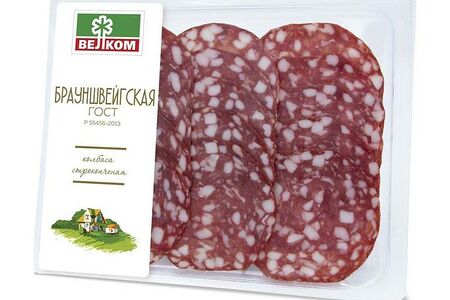 Колбаса сырокопчёная Брауншвейгская полусухая Велком, нарезка доставка