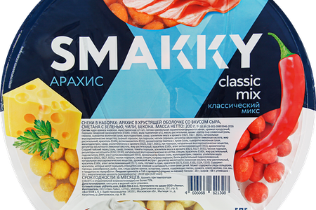 Арахис SMAKKY Classic mix снековая тарелка, со вкусом сыра, сметаны, чили, бекона подойдет для быстрого перекуса и составит удачное сочетание с прохладительными напитками. Такой продукт хорошо утоляет голод, вносит разнообразие в рацион и полезен для здоровья. Арахис богат белком, витаминами из группы В, антиоксидантами, содержит калий, фосфор, магний, кальций и другие микро- и макроэлементы. Он заряжает энергией, нормализует обмен веществ, замедляет старение, укрепляет мышцы и улучшает работу мозга.