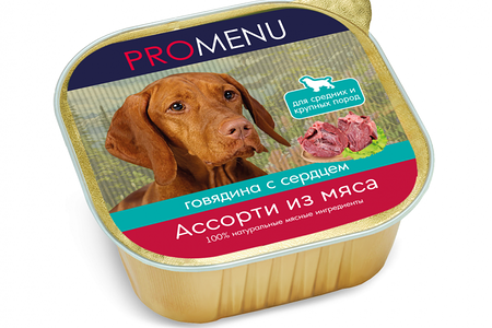Влажный корм Pro Menu для собак средних и крупных пород, ассорти из мяса говядины с сердцем, 300 г доставка