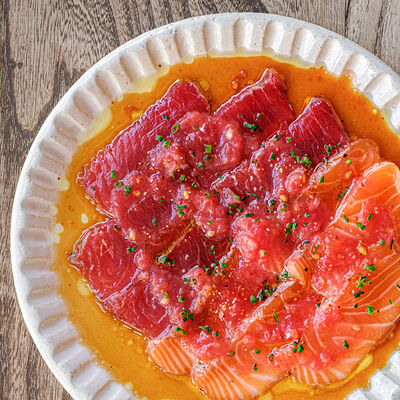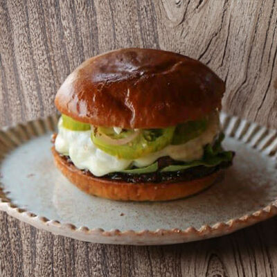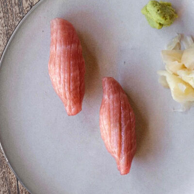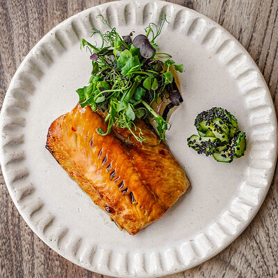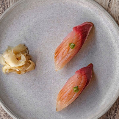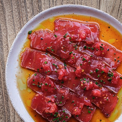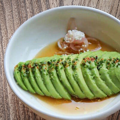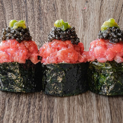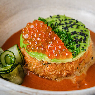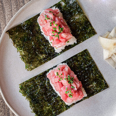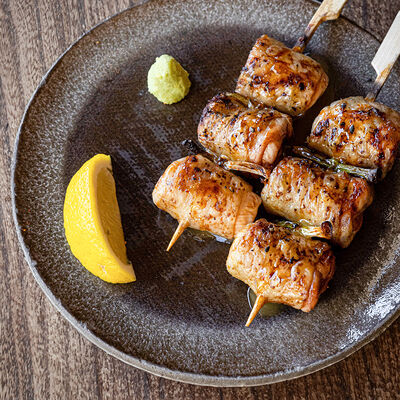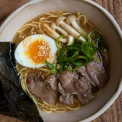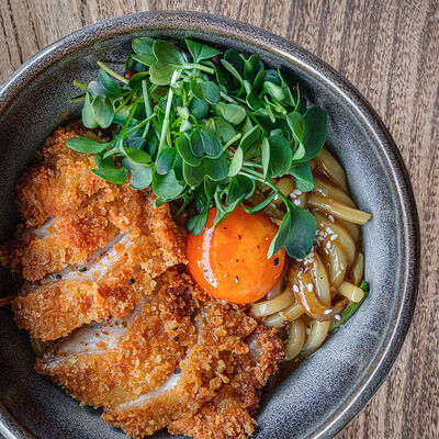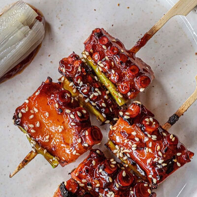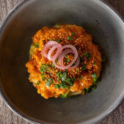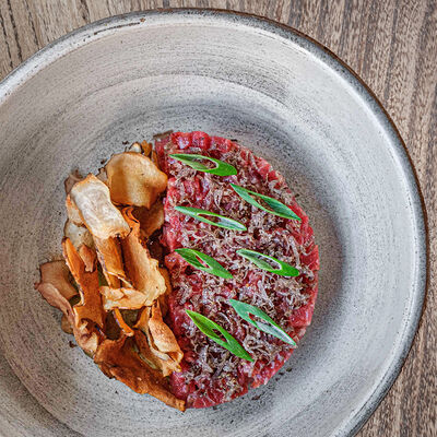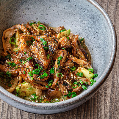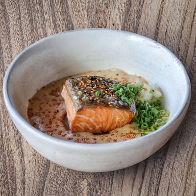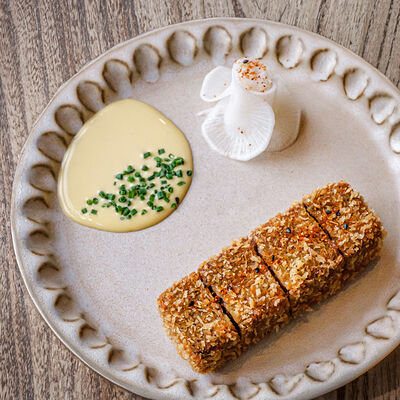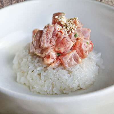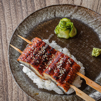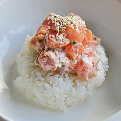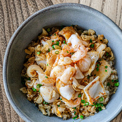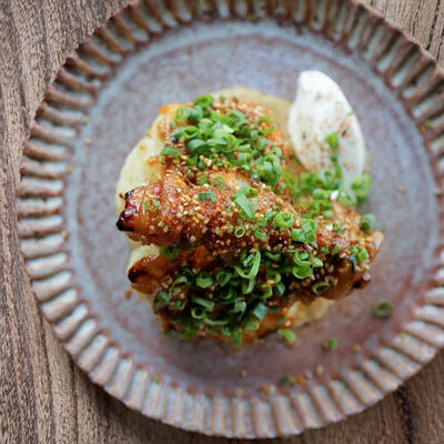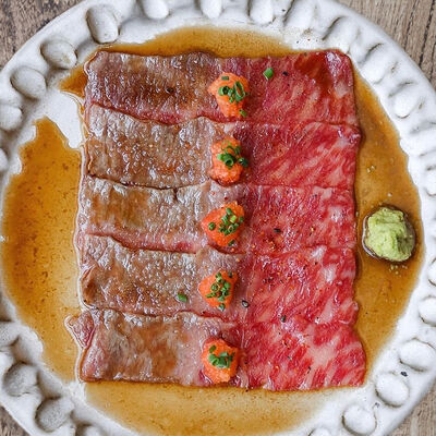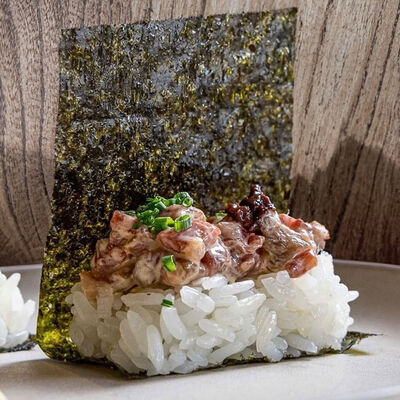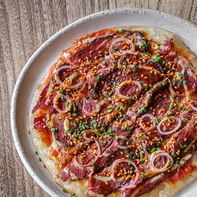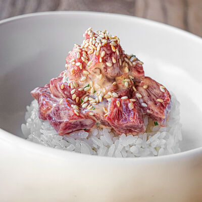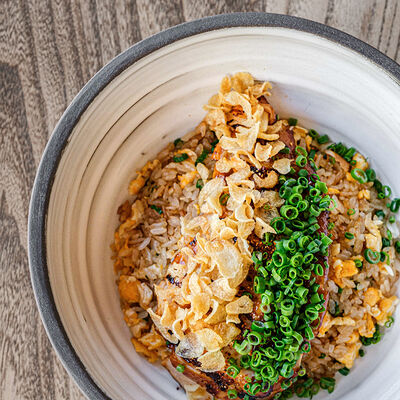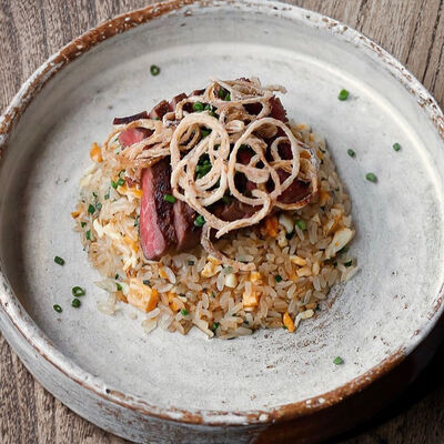 Маринованный в паприке фланк-стейк гриль, обжаренный суши-рис с яйцом и зеленым луком, соус барбекю, чесночное масло, луковые чипсы, специи шичими тагараши