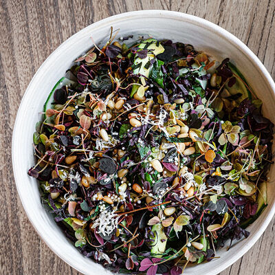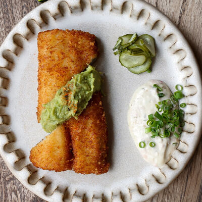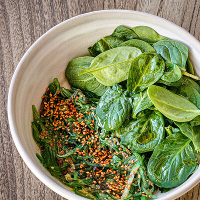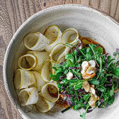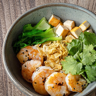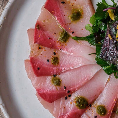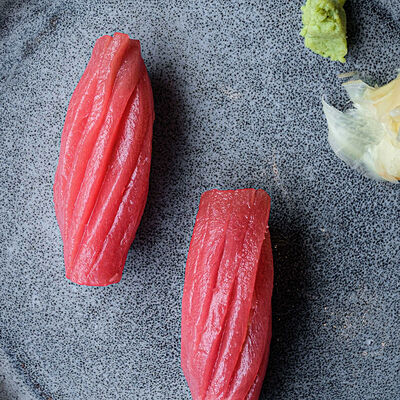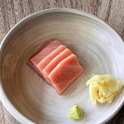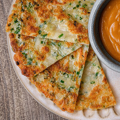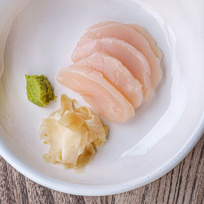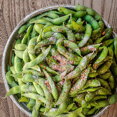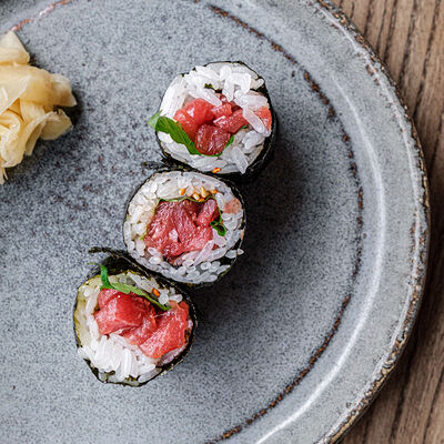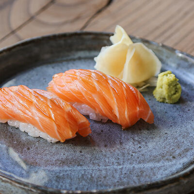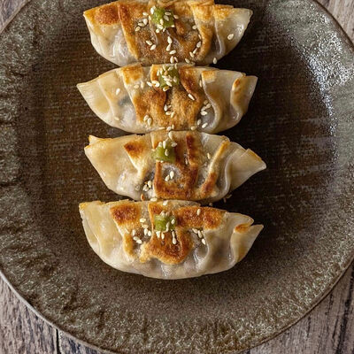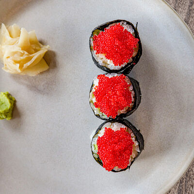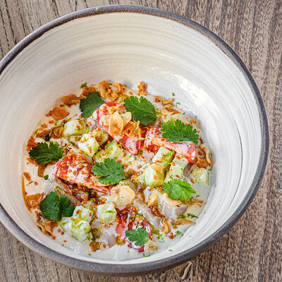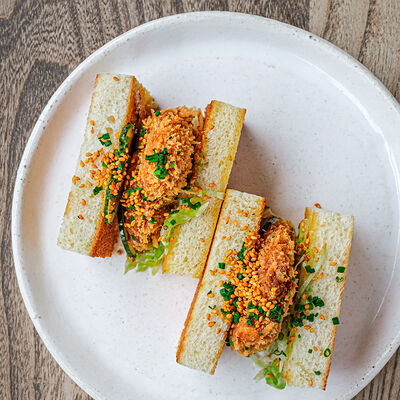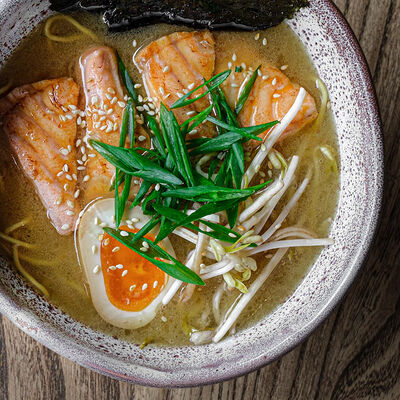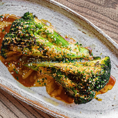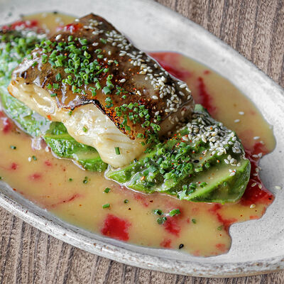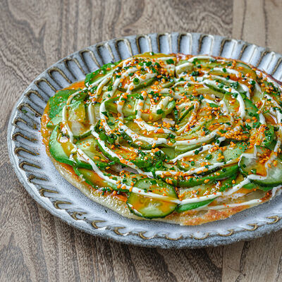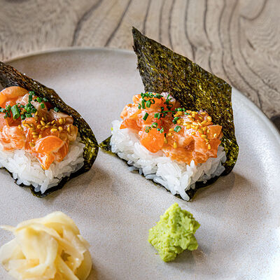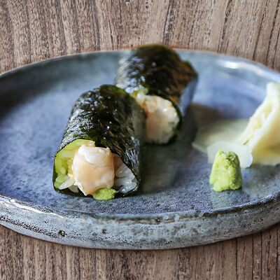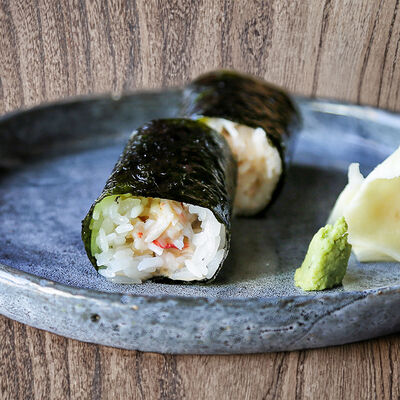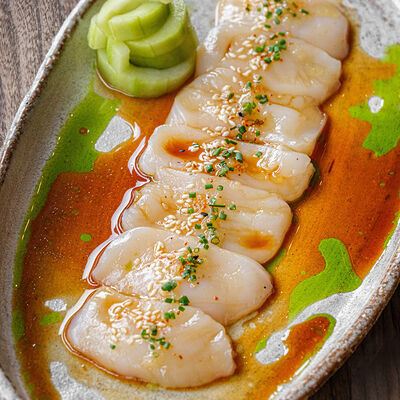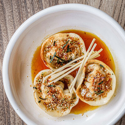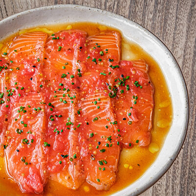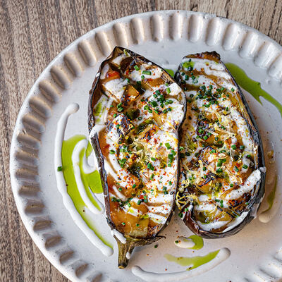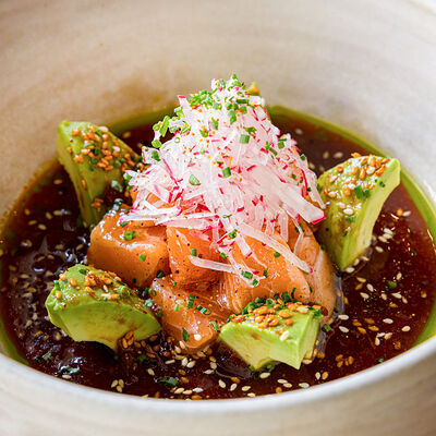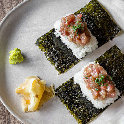 Маринованный в паприке фланк-стейк гриль, обжаренный суши-рис с яйцом и зеленым луком, соус барбекю, чесночное масло, луковые чипсы, специи шичими тагараши