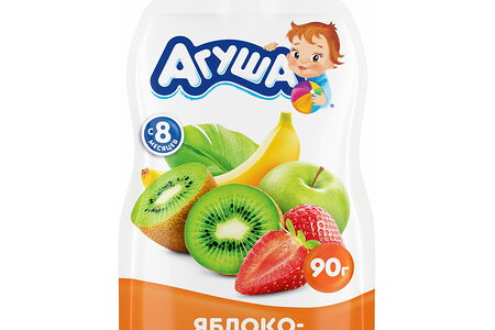 Детское фруктово-ягодное пюре Агуша Яблоко-банан-клубника-киви, с 8 месяцев, 90г доставка