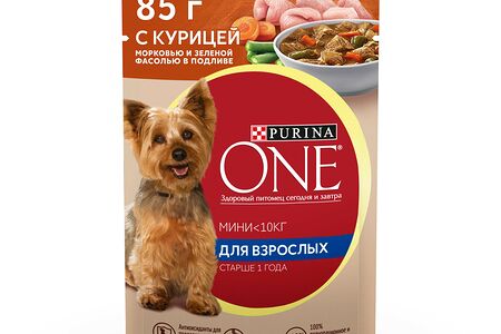 Влажный корм Purina ONE Мини Взрослая для собак мелких пород старше 1 года, с курицей, морковью и зеленой фасолью в подливе 85 г доставка