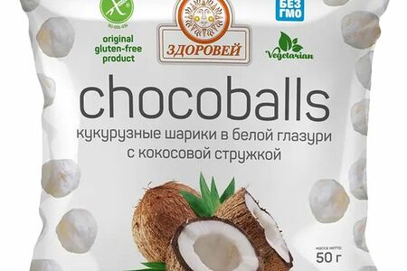 Готовый завтрак Здоровей Непоседа Шарики безглютеновый в белой глазури с кокосом, 50г доставка