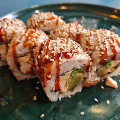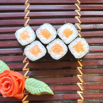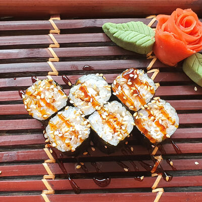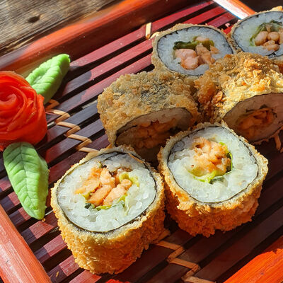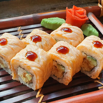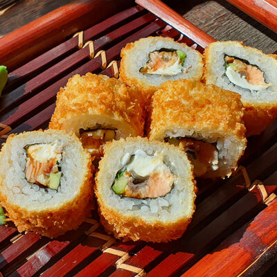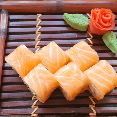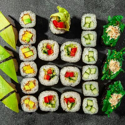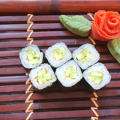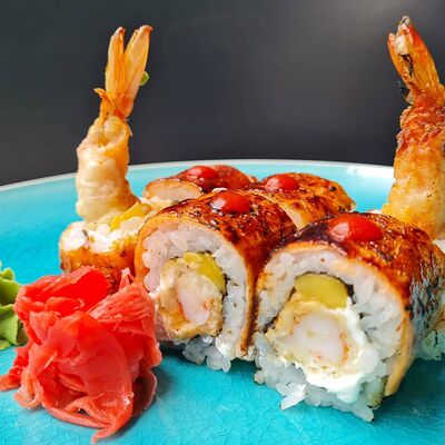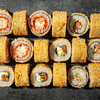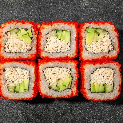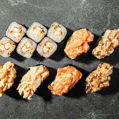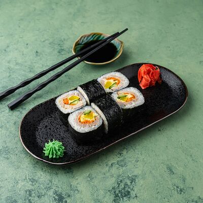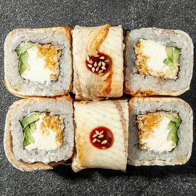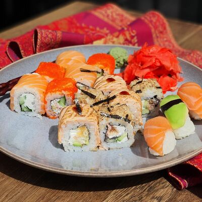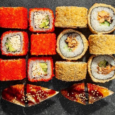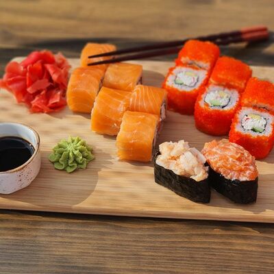 Ролл Филадельфия (1/2 порции), ролл Калифорния (1/2 порции), ролл тайга (1/2 порции), ролл салмон скин (1/2 порции), суши с лососем (2 шт.) и суши авокадо