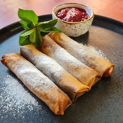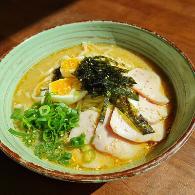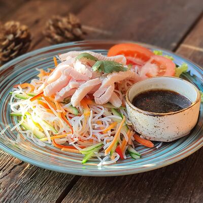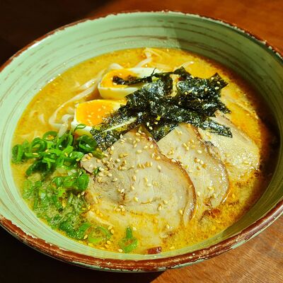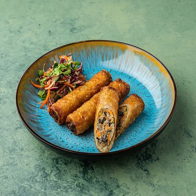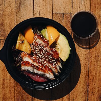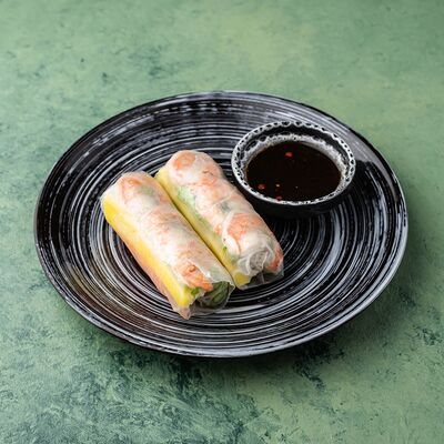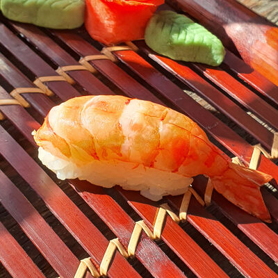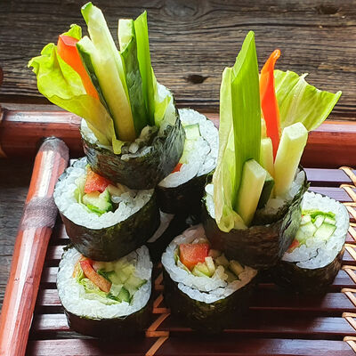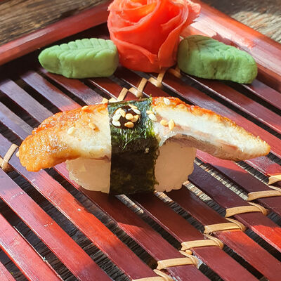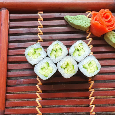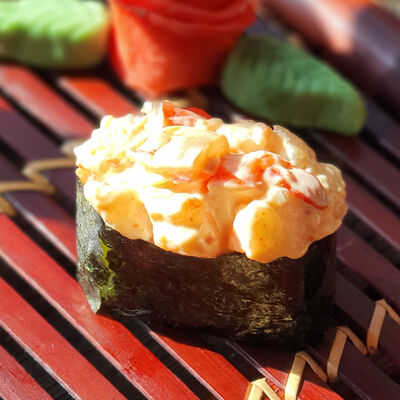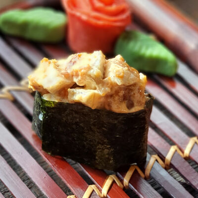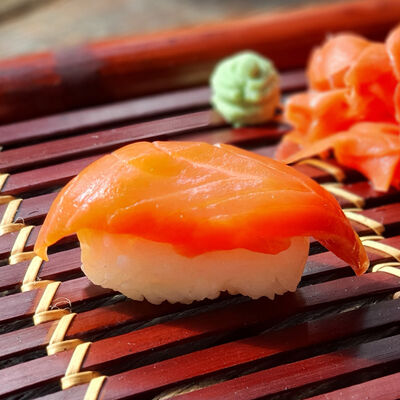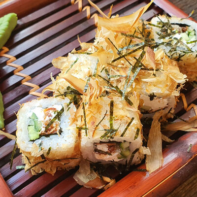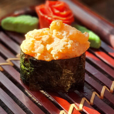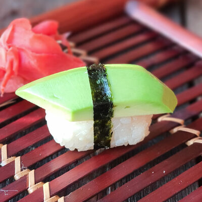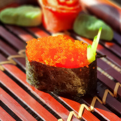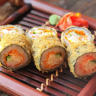 Ролл Филадельфия (1/2 порции), ролл Калифорния (1/2 порции), ролл тайга (1/2 порции), ролл салмон скин (1/2 порции), суши с лососем (2 шт.) и суши авокадо