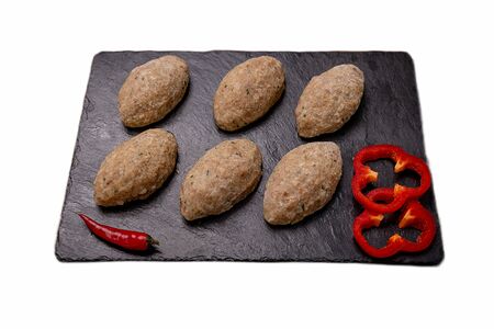 Филе бедра куриного, лук репчатый, батон, масло растительное, яйцо куриное, майонез, зелень (петрушка), соль, специи, перец черный