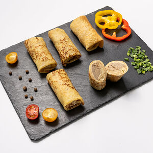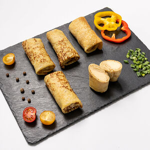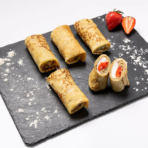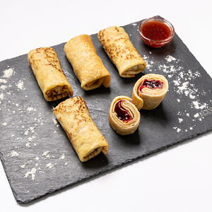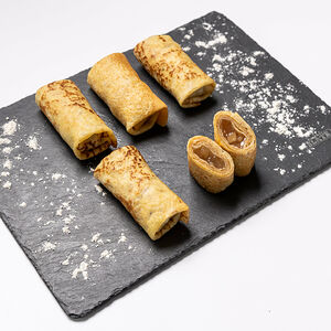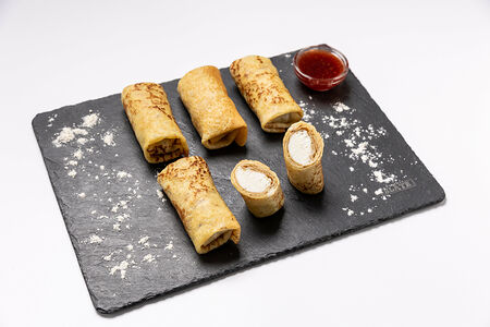 Творог, сахар, тесто блинное (мука высшего сорта, яйцо куриное, молоко, сахар, сода пищевая, соль, вода). Разогрейте блины в микроволновке в течение 2-3 минут. По желанию, можно обжарить на сковородке в растительном или сливочном масле до появления золотистой и хрустящей корочки