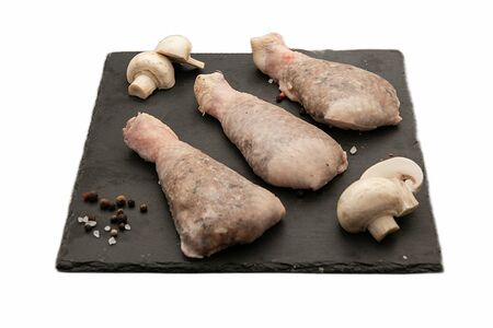 Мясо куриное (голень), грибы шампиньоны, лук репчатый, масло растительное, соль поваренная, перец черный молотый