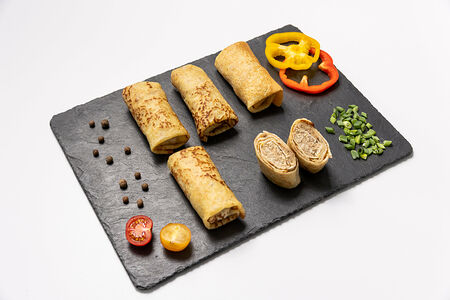 Курица отварная, лук репчатый, соль, перец чёрный молотый, тесто блинное. Тесто: вода, сухое молоко, яйцо куриное, сахар, соль, сода, мука высшего сорта, масло растительное. Разогрейте блины в микроволновке в течение 2-3 минут. По желанию, можно обжарить на сковородке в растительном или сливочном масле до появления золотистой и хрустящей корочки