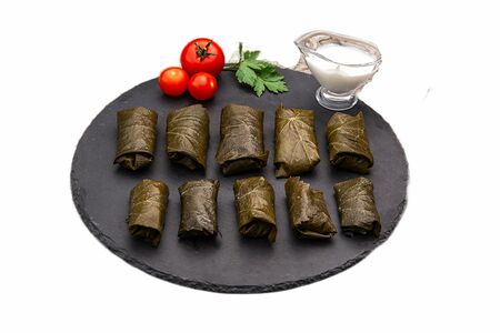 Мясо говядины, мясо баранины, лук репчатый, виноградный лист, крупа, рис, зелень (кинза, петрушка), соль поваренная, специи (зира, хмели-сунели, перец черный молотый)