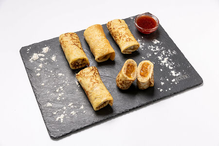Конфитюр абрикосовый. Тесто блинное: мука высшего сорта, яйцо куриное, молоко, сахар, сода пищевая, соль, вода. Разогрейте блины в микроволновке в течение 2-3 минут. По желанию, можно обжарить на сковородке в растительном\сливочном масле до появления золотистой и хрустящей корочки