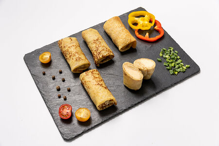 Сыр, чеснок свежий, майонез. Тесто блинное: мука высшего сорта, яйцо куриное, молоко, сахар, сода пищевая, соль, вода. Разогрейте блины в микроволновке в течение 2-3 минут. По желанию, можно обжарить на сковородке в растительном\сливочном масле до появления золотистой и хрустящей корочки