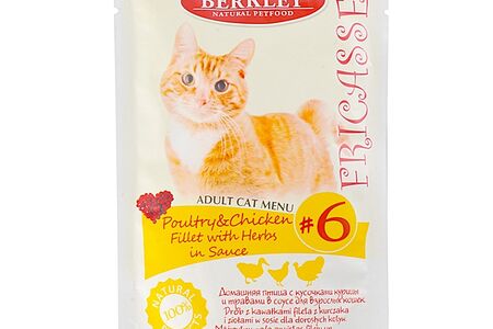 Корм для взрослых кошек Berkley Фрикасе №6 домашняя птица с кусочками курицы и травами в соусе доставка