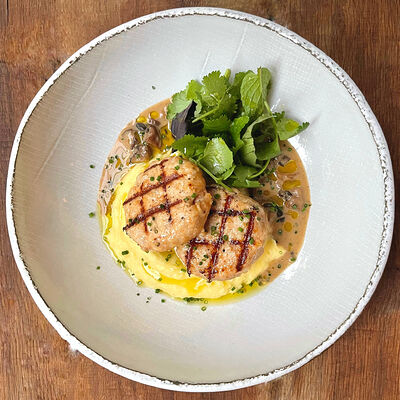 Картофельные ньокки, мясо утки конфи (утиные окорочка, соль, сахар-песок, апельсиновая цедра), демиглас, куриный бульон, шалфей (листья), масло растительное, масло нуазет, сибулет, лук-шалот, петрушка, оливковое масло, пармезан, сливочное масло, вешенки жареные, черный перец, страчателла
