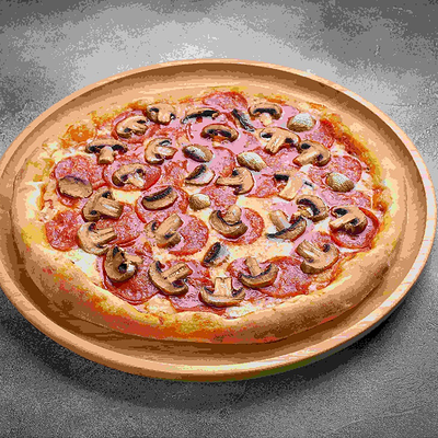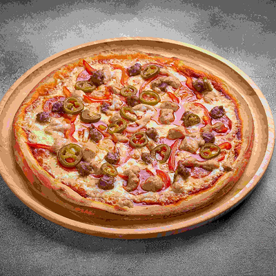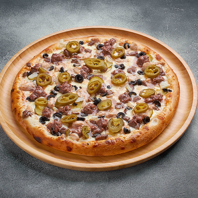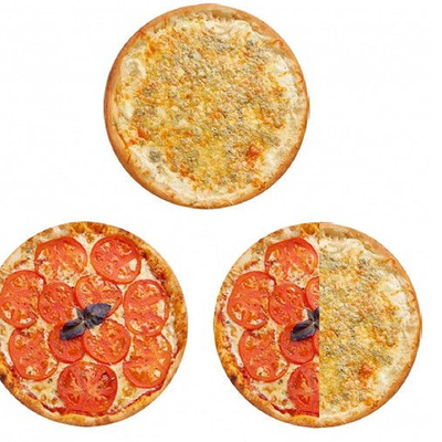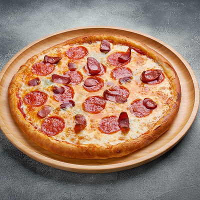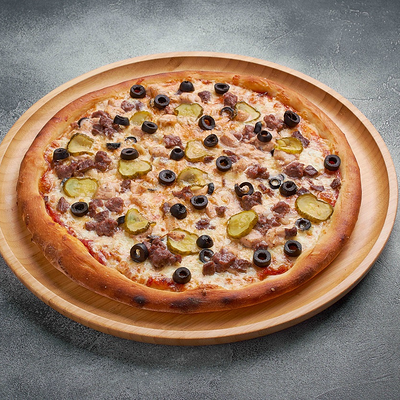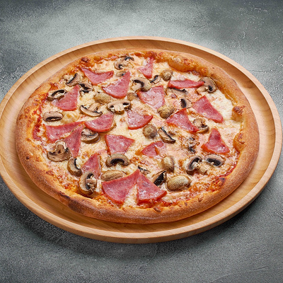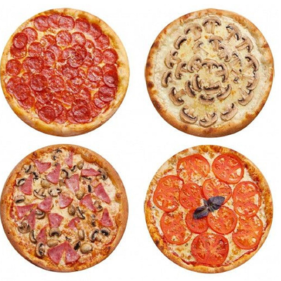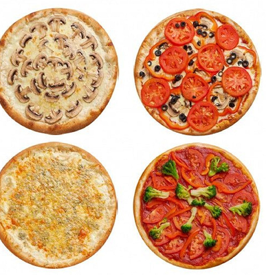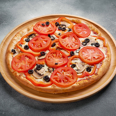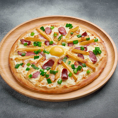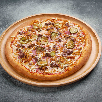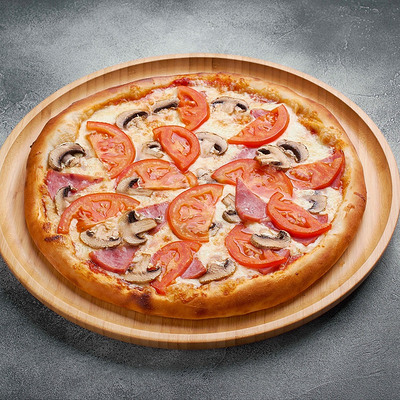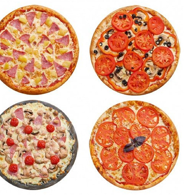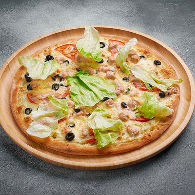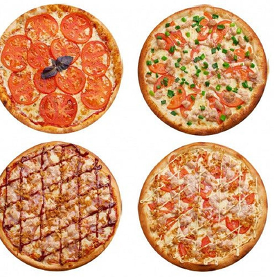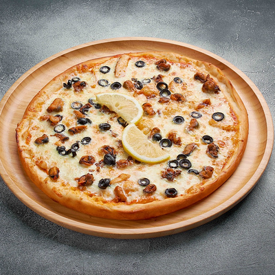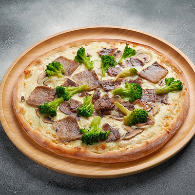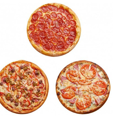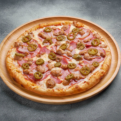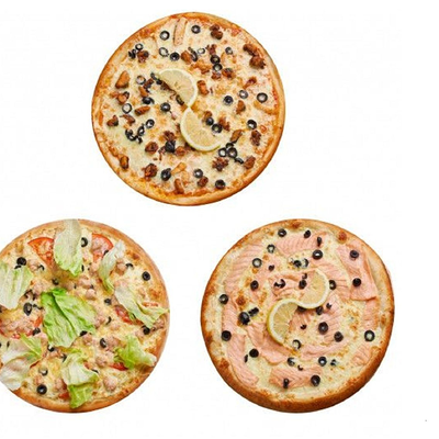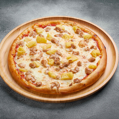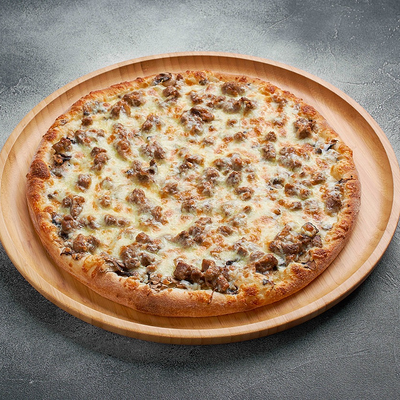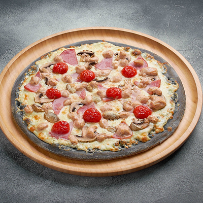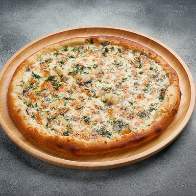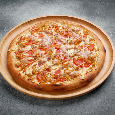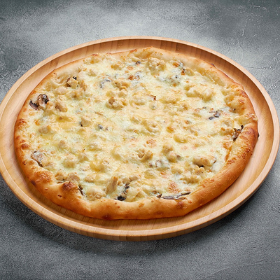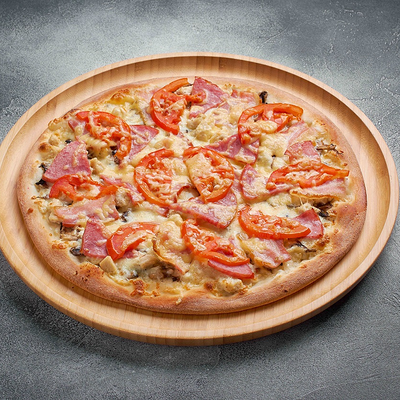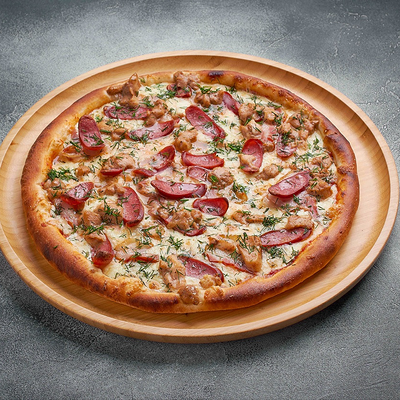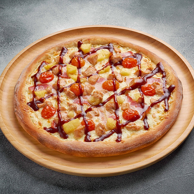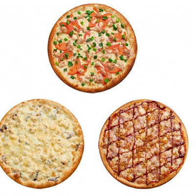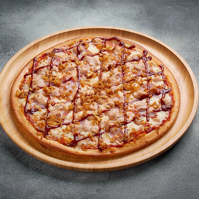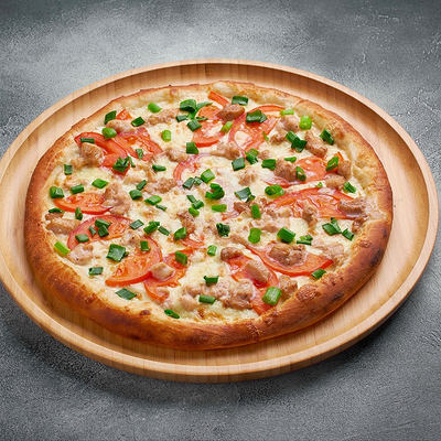 Чикен барбекю (сыр моцарелла, куриная грудка, помидоры, сливочный соус, соус барбекю, зеленый лук), Куриная (сыр моцарелла, куриная грудка, помидоры, сливочный соус, зеленый лук), Крими чикен (сливочный соус жюльен, филе куриной грудки с грибами, сыр моцарелла, сыр пармезан) (25 см)
