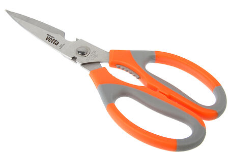 Универсальные кухонные ножницы всегда необходимы для разделки готовой курицы, вскрытия упаковок, чистки рыбы и др. Также ножницы имеют функцию раскалывания орехов и открывалки бутылок. Ножницы кухонные сделаны из высококачественного металла. Ножницы имеют надежное винтовое крепление.