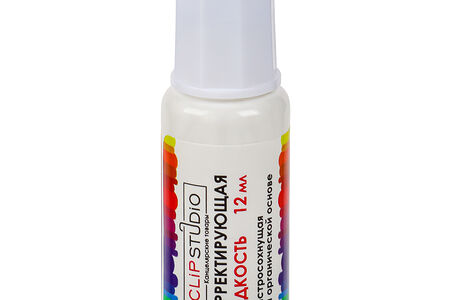 Жидкий корректор Clipstudio с кисточкой. Используйте для точечных правок или чтобы исправлять целые строки текста. Корректор на органической основе: быстро высыхает, не надо ждать и дуть на него, чтобы высушить. Объем флакона - 15 мл: удобно пользоваться, занимает мало места в пенале или в кармане.