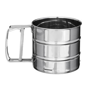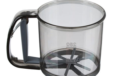 Кружка-сито - ёмкость для просеивания муки, сахарной пудры, манки, какао и других мелких сыпучих продуктов. Кружка состоит из корпуса с двойным ситовым дном и ручки, внутри которой находится пружина. Благодаря ручке-рычагу вы с легкостью просеете муку, без труда потом очистите изделие от остатков.