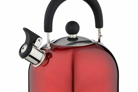 Чайник объемом 2,5 л изготовлен из нержавеющей стали, красного цвета, с несъемным свистком и бакелитовой ручкой черного цвета подходит для всех типов плит, включая индукцию.