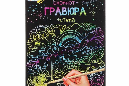 Видите только черный фон? Однако под ним скрывается волшебство — яркие цветные покрытия. Возьмите бамбуковый стек и начинайте рисовать, попутно соскребая верхний темный слой. На ваших глазах будут появляться сочные линии и завитушки, которые станут частью фантастического шедевра. Блокнот-гравюра из 8 страниц позволяет творить в свое удовольствие — делать надписи, узоры и забавные картинки. Ограничить творческий потенциал может только размер листа.