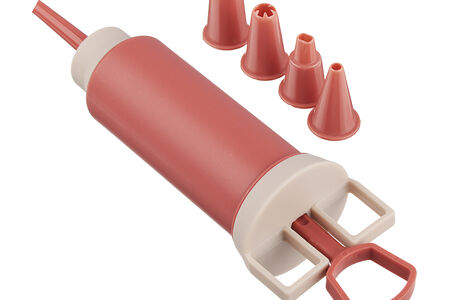 Кулинарный шприц используется для украшения тортов, выпечки и основных блюд. Инструмент очень прост в использовании. Не впитывает запахи и легко моется. Работать таким прибором очень удобно, не выскальзывает из рук, так как имеет шероховатую поверхность. Удивите своих близких и гостей благодаря красивым узорам, которые получаются с помощью кулинарного шприца!