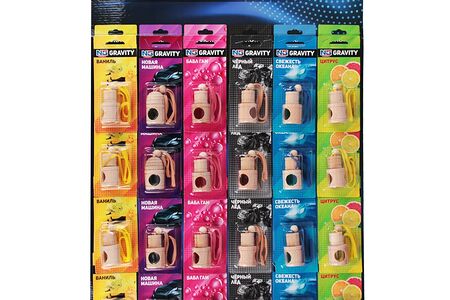 Ароматизатор в машину Gravity с миксом ароматов выполнен ввиде деревянного бочонка со стеклянной капсулой внутри. Чтобы он начал работать, необходимо снять пластиковую заглушку на сосуде с парфюмированой жидкостью и перевернуть ароматизатор. Деревянная оболочка пропитается ароматом освежителя и будет отдавать его в пространство автомобиля до полного высыхания бочонка. После угасания активности запаха процедуру увлажнения ароматизатора следует повторить.