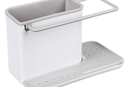 Держатель для моющих средств и губок от Vetta - в нем хранят моющие и чистящие средства для посуды, щетки, губки и салфетки. С поддоном для воды, поэтому вокруг держателя всегда сухо. Можно ставить на деревянную столешницу. Материал - пластик. Не ржавеет, служит долго. Размеры 21 х 11 х 13 см.