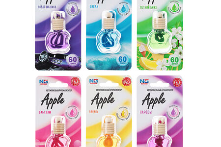 Подвесной ароматизатор Apple от NEW GALAXY для автомобиля с ароматами Бабл гам, Океан, Новая машина, Летний бриз, Ваниль и Парфюм. Подвешивают на шнурок к зеркалу заднего вида. Бутылочка в форме логотипа Apple с деревянной крышкой: красиво выглядит, не мешает обзору.