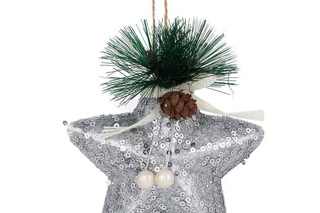 Подвеска декоративная СНОУ БУМ в виде серебристой звезды с хвойным декором – красивая и оригинальная новогодняя игрушка, которая может стать элементом праздничной дизайнерской композиции, украсит елку или пригодится для творчества. Блестящая и яркая фигурка в пайетках и с глиттером завораживает своим видом и привлекает внимание. Размер 11х11 см.