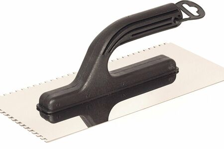 Гладилка прямая (зубчатая) – изготовлена из нержавеющей стали, оснащена эргономичной пластиковой ручкой. Используется для качественного нанесения различных сухих смесей, их распределения по поверхности, а также сглаживания неровностей и швов. В ремонтных, а так же отделочных работах гладилка малярная и штукатурная используется повсеместно. Она незаменима в случаях, когда необходимо нанести много раствора тонким слоем. Применяется для шпаклевки, обычной и декоративной штукатурки, клея и различных строительных смесей.