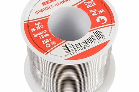 Припой с канифолью REXANT представляет собой проволоку (диаметром 1 мм) из сплава олова (60 %) и свинца (40 %). Используется в пайке для соединения деталей между собой и позволяет создать герметичный, механически прочный (устойчивый) шов. Нагреваясь до температуры плавления (183...188 C) припой: расплавляется, смачивает спаиваемый металл и, растекаясь по нему - заполняет место между соединяемыми деталями.