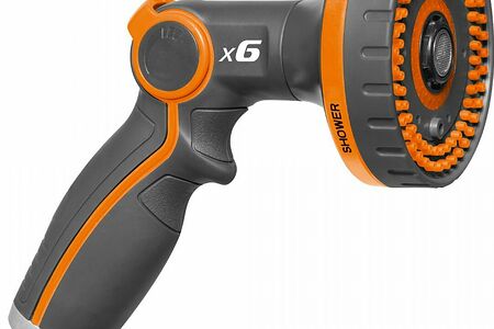 Оснащен регулировкой интенсивности распыления в 6 режимах от слабой до жесткой струи для эффективного полива участка.