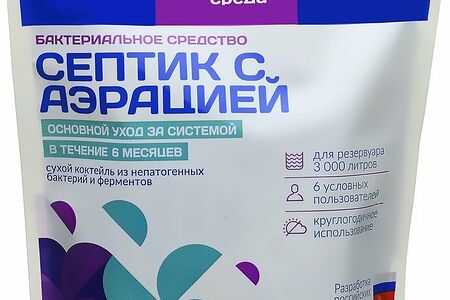 Септик с аэрацией. Устраняет неприятный запах, разлагает органику, фекалии, жиры, бумагу, крахмал, мочевину, белок. Снижает необходимость очистки и авто-ассинезации. Создан Российскими учеными на основе микроорганизмов постоянно присутствующих в почвах России.Содержит высокую концентрацию (2Х10⁹ КОЕ) 5 видов спор аэро и анаэробных бактерий. Композиция бактерий подобрана с учетом особенностей эксплуатации септиков с аэрацией: повышенный доступ кислорода в одной части системы и ограниченный в другой. Препарат нетоксичен для человека, животных, растений.