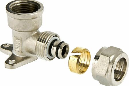 Угловой латунный никелированный фитинг с креплением (водорозетка) для соединения металлополимерного трубопровода с компонентом системы, имеющим резьбовое подключение. Резьба фитинга - внутренняя трубная по ГОСТу 6357, 16 х 1/2". Cерия VTm.354.N