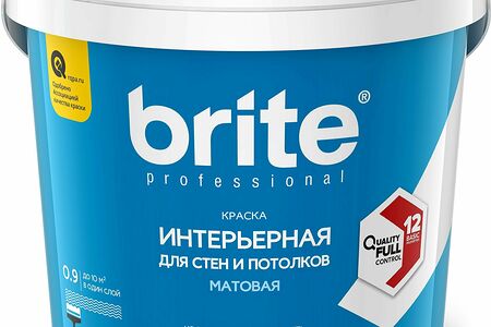 Профессиональная акриловая краска Brite Professional Quality Full Control для стен и потолков. После высыхания образует супербелое матовое покрытие, устойчивое к сухой уборке. Удобна при нанесении, не брызгает с малярного инструмента, легко и ровно наносится. Подходит для обоев под покраску.
