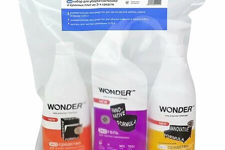 WONDER LAB набор экологичных средств для уборки из 3-х средств по выгодной цене:1. Экогель для чистки сантехники 0,75 л2. Экосредство для чистки кухонных плит и духовых шкафов и грилей 0,55 л3. Универсальное экосредство для чистки мягкой мебели, ковров и тканей 0,55 л
