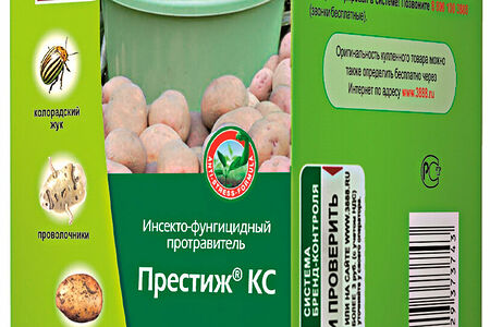 Инсектицидно-фунгицидное средство "Престиж КС" используется для обработки картофеля до или во время посадки. Расход составляет 70-100 мл на один литр воды.